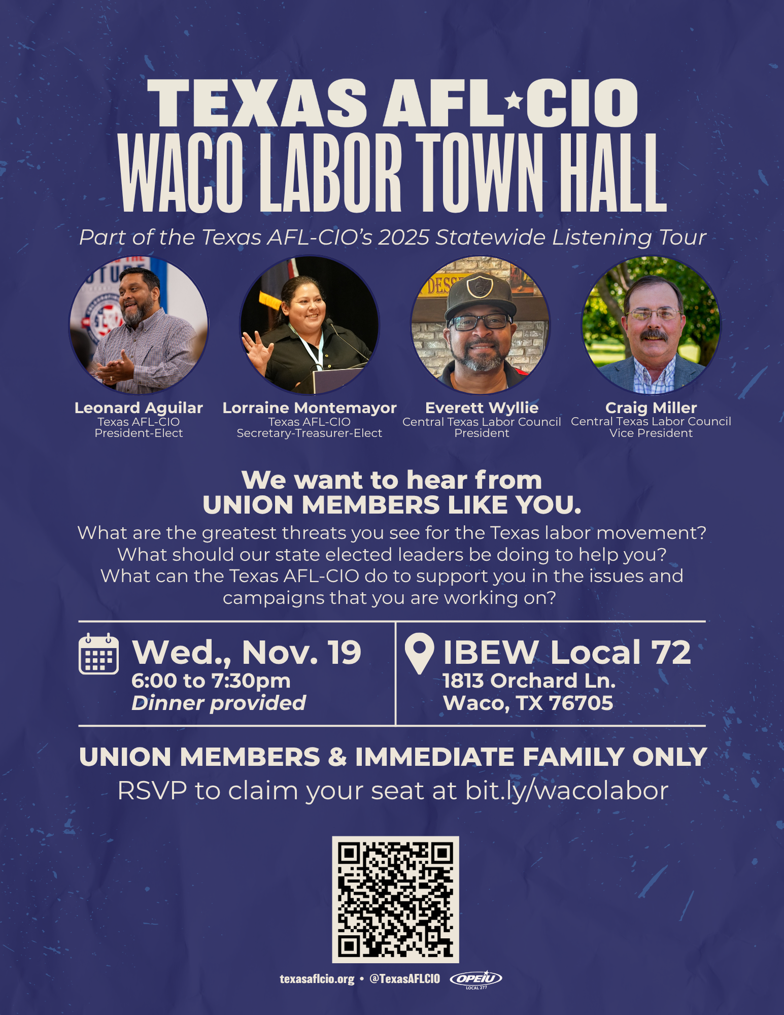 We want to hear from union members like YOU at our Waco Labor Town Hall!